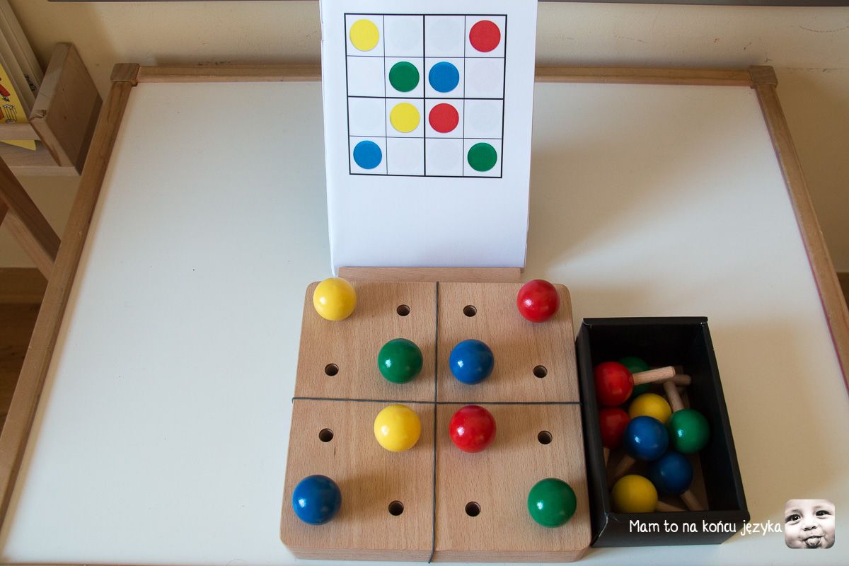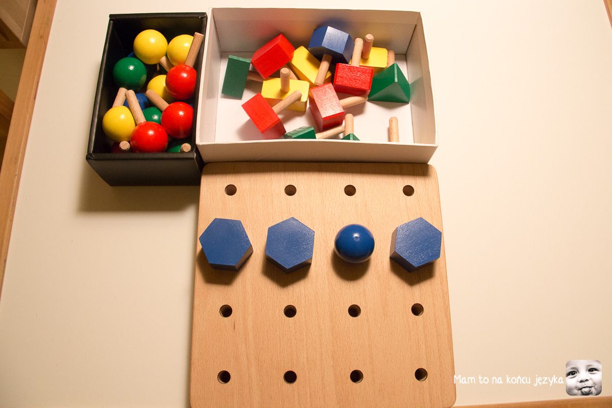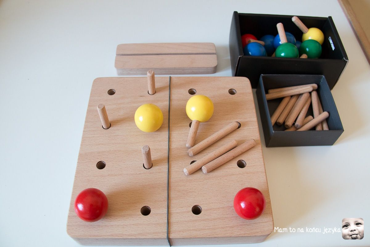 Tu z kolei widzicie układankę tematyczną, wykorzystującą różne elementy zestawu - kołki, kule, recepturki. Złożoność tego zadania jest znacznie wyższa. W całym materiale towarzyszącym układance zauważycie, że spełnione są tezy Montessori. Decydujące są tu: