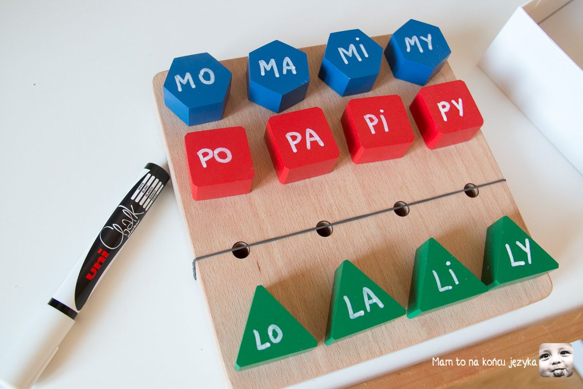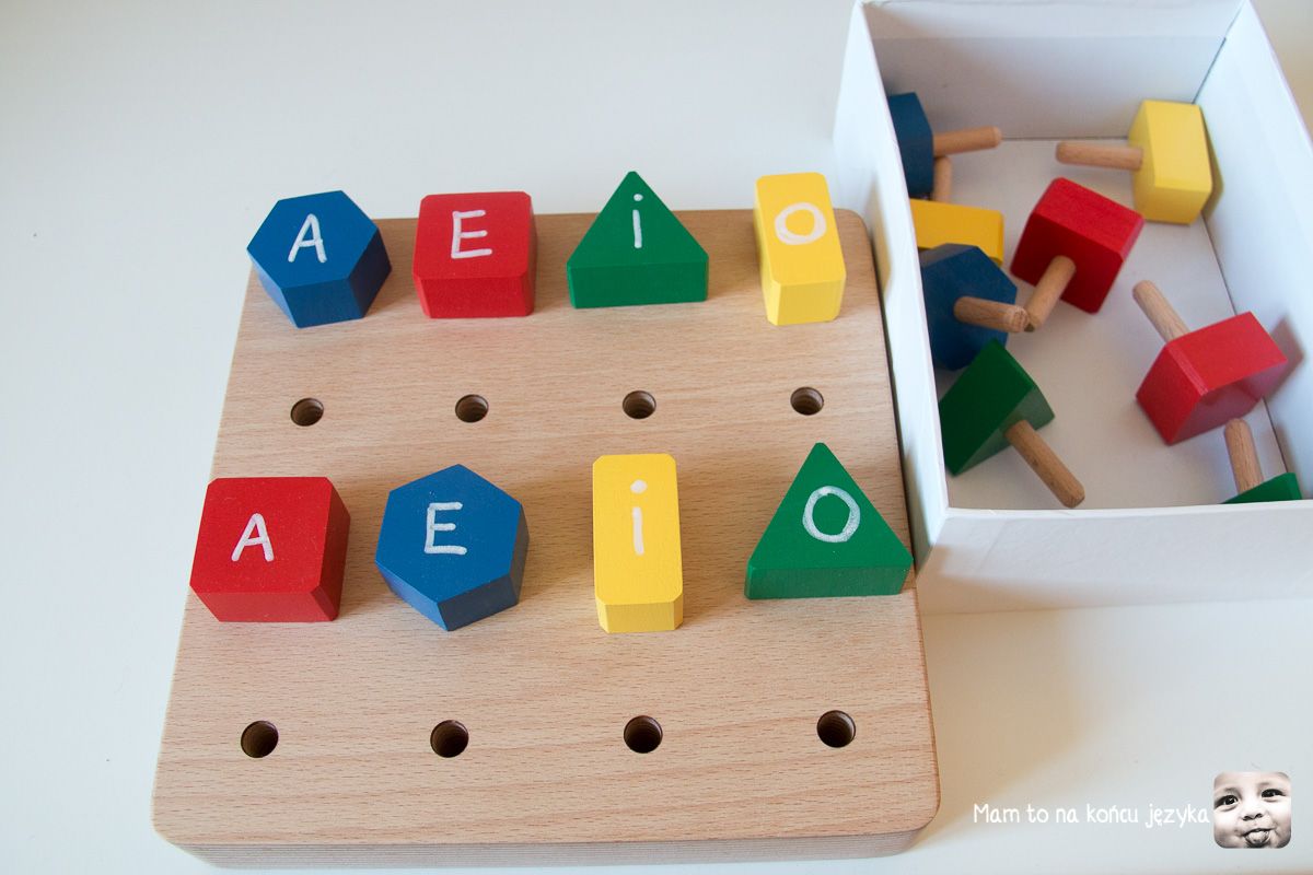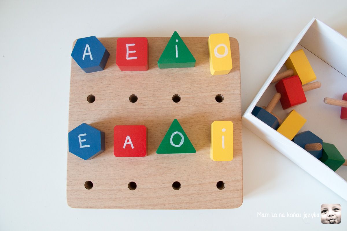 Do pracy z figurami zaopatrzyłam się w marker kredowy - jest on łatwo ścieralny i mogę nim nanieść na figury tekst do czytania. Poniżej zadanie "ułóż takie same figury i przeczytaj litery" - jest to u nas szalenie ważne ćwiczenie, ponieważ jako dziecko dwujęzyczne syn ma do opanowania dużo większy zestaw samogłosek niż w samym języku polskim. Widzę, że nie zawsze trafia w odpowiedni dźwięk, więc czytanie takich etykiet jest formą przemycenia terapii logopedycznej.