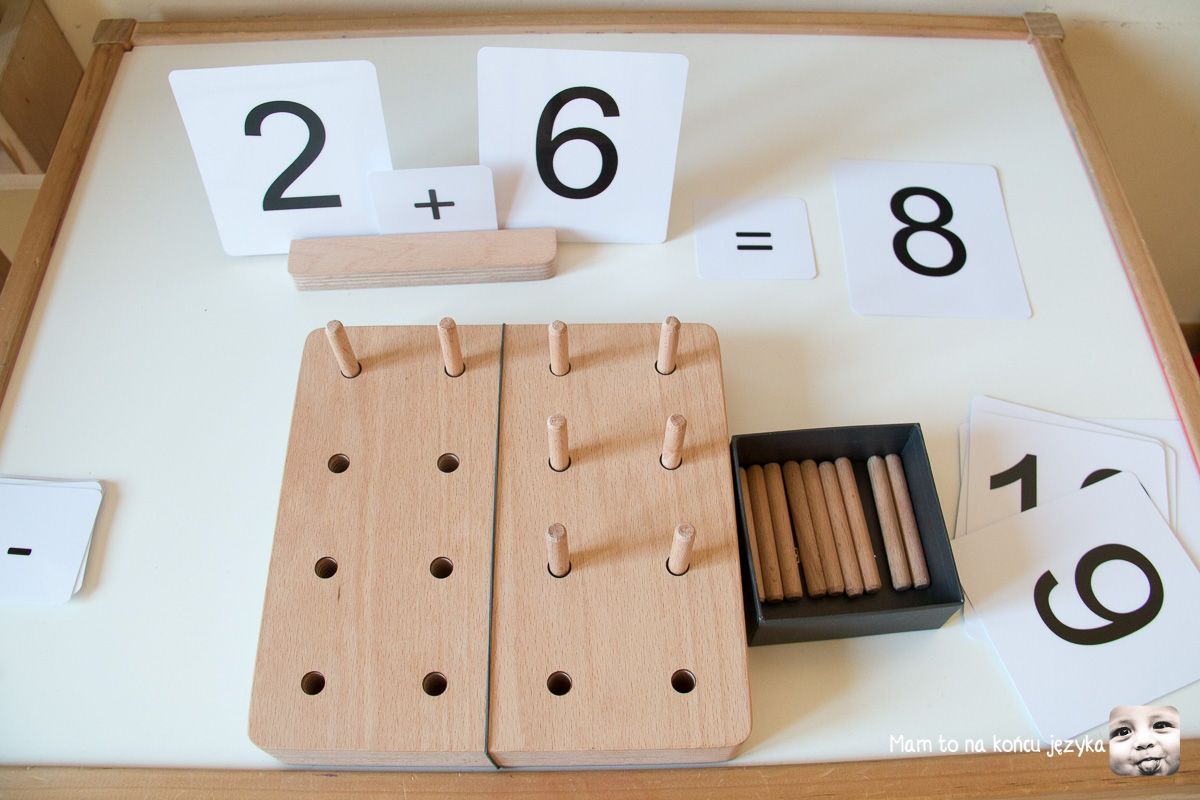 Tu z kolei ćwiczymy rozumienie zapisu działań matematycznych - na kartach układam 2+6, a dziecko ma za zadanie obliczyć wynik przy pomocy kołków i zapisać go przy pomocy kart.