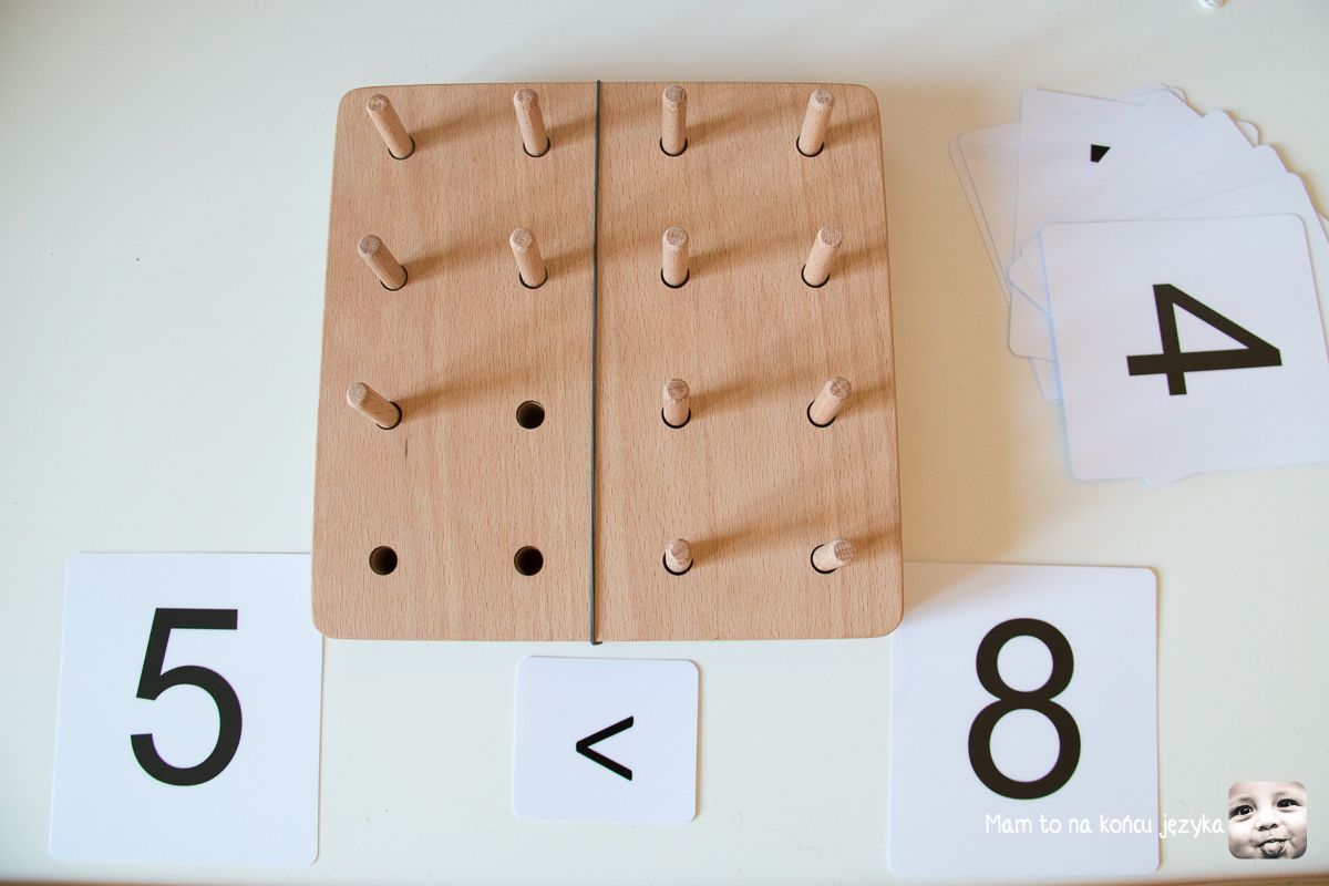 Z bardziej zaawansowanych zastosowań możemy łatwo wprowadzić nierówności - mamy do dyspozycji karty z operatorami działań. Tu dziecko zlicza kołki po lewej i po prawej, a następnie układa z kart pisemną reprezentację nierówności.