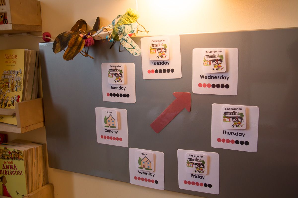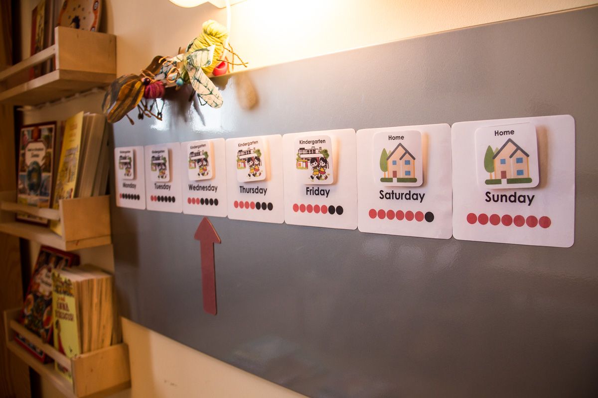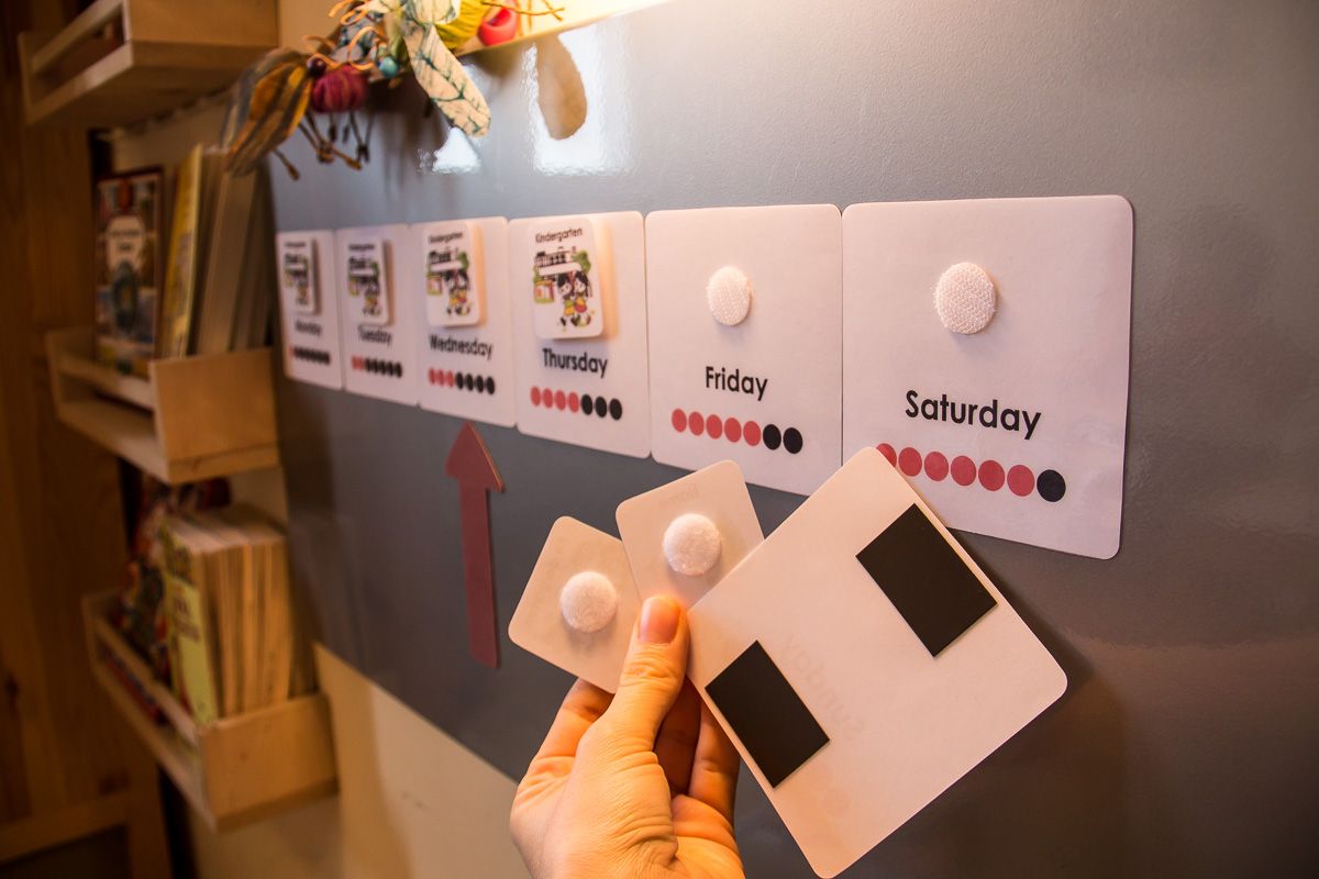 Karty z dniami tygodnia zalaminowałam, po czym przyczepiłam magnesem samoprzylepnym do tablicy. Na każdej karcie mogę przyczepić rzepem dodatkową kartę, która będzie sygnalizowała dzień przedszkolny lub taki spędzany w domu. Strzałka również jest podklejona magnesem.