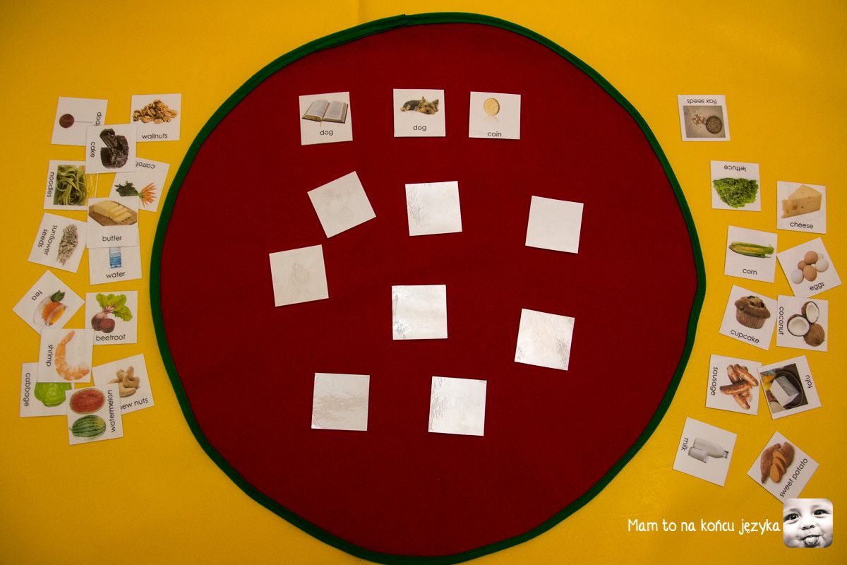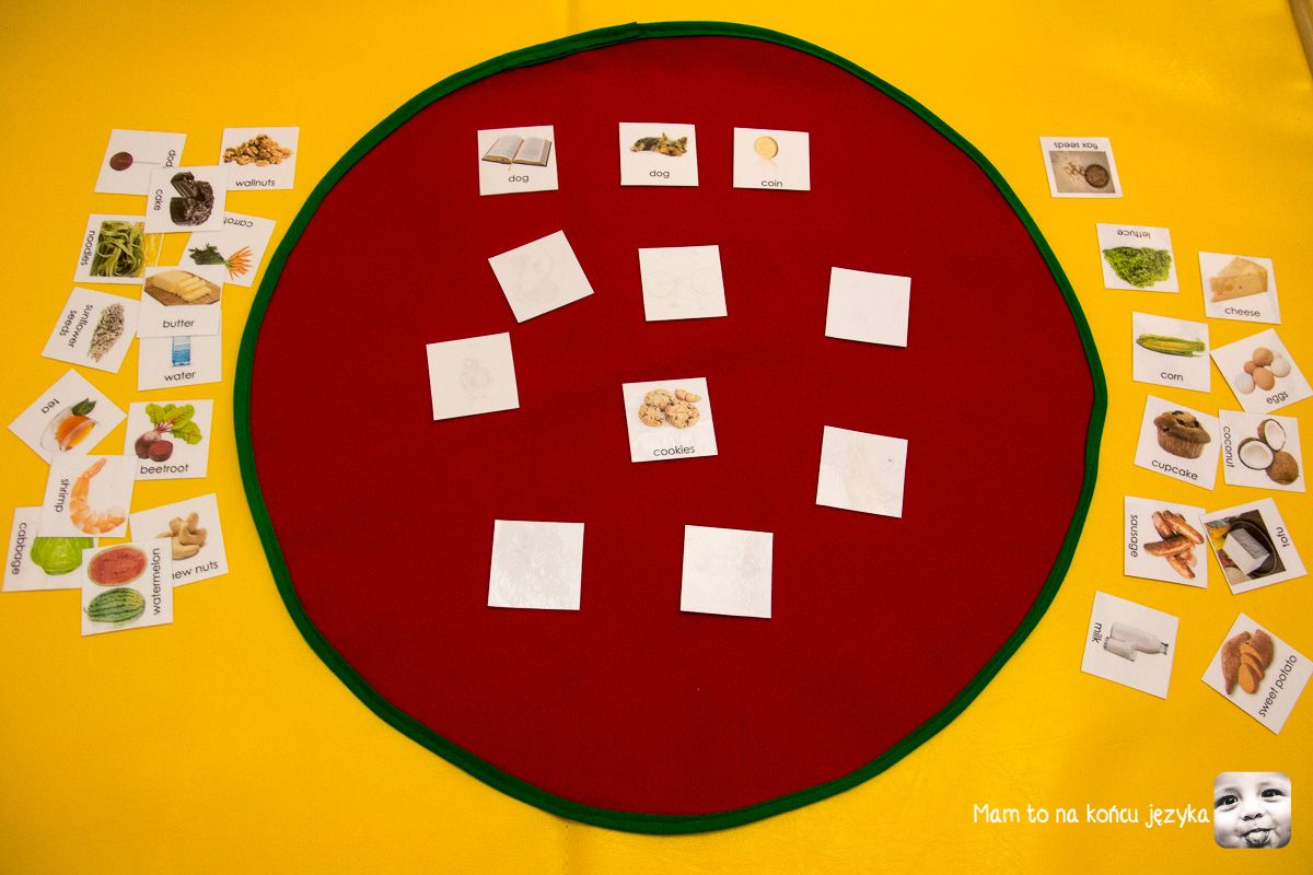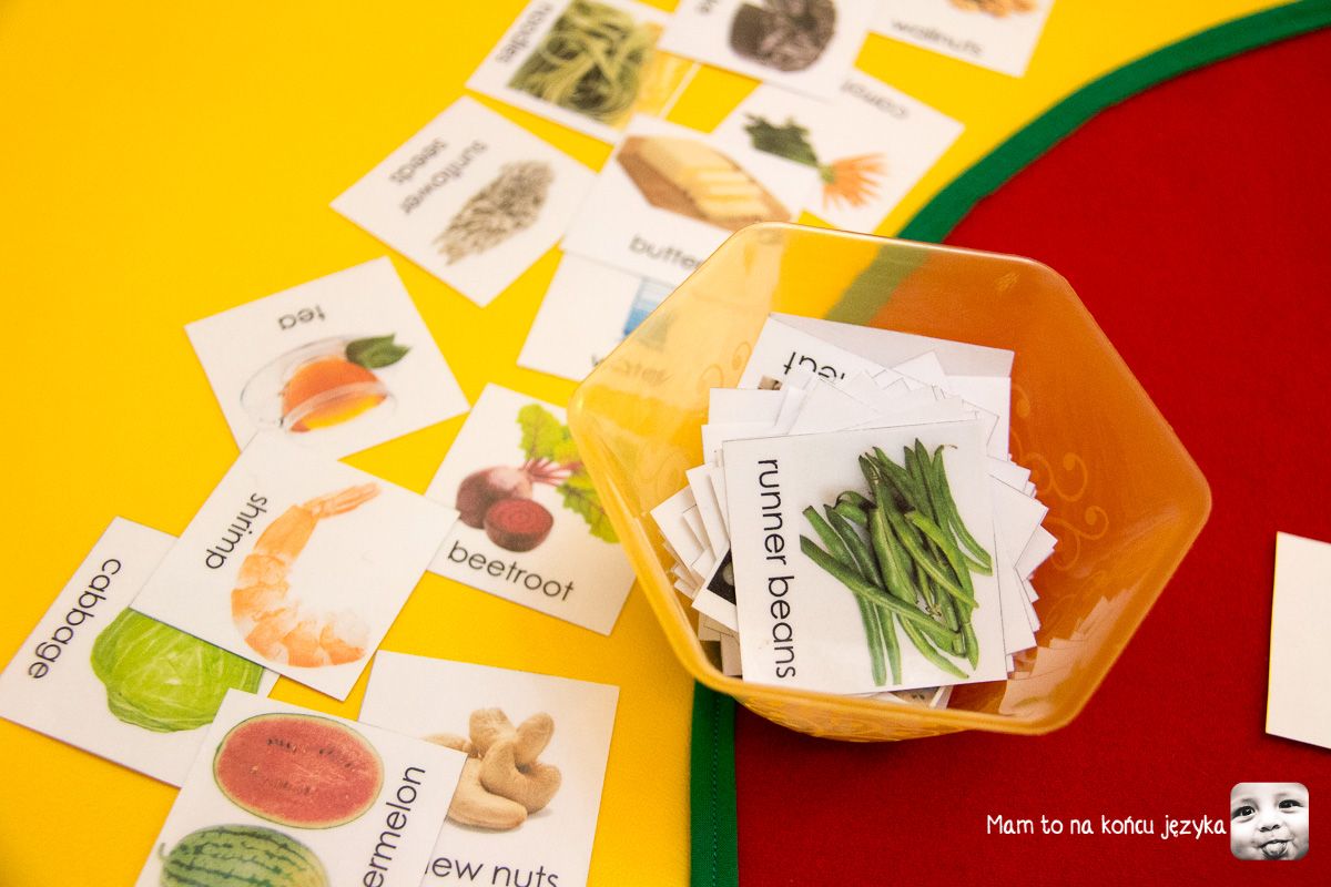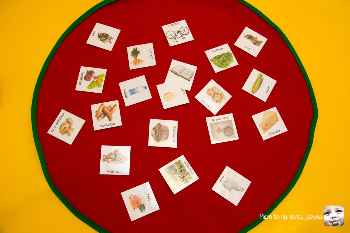 Przepis jest bardzo prosty – potrzebujesz wyłącznie kart ze zdjęciami różnych przedmiotów. Znajdziesz je u mnie na blogu, w kilku wpisach, ja korzystałam z kart z wpisów o zdrowym odżywianiu oraz z grą „Who stole the cookie from the cookie jar?”
