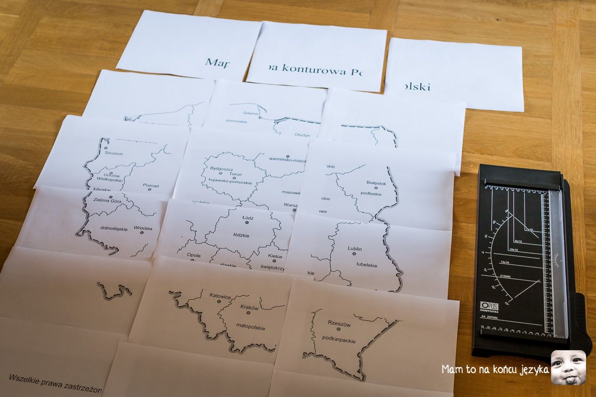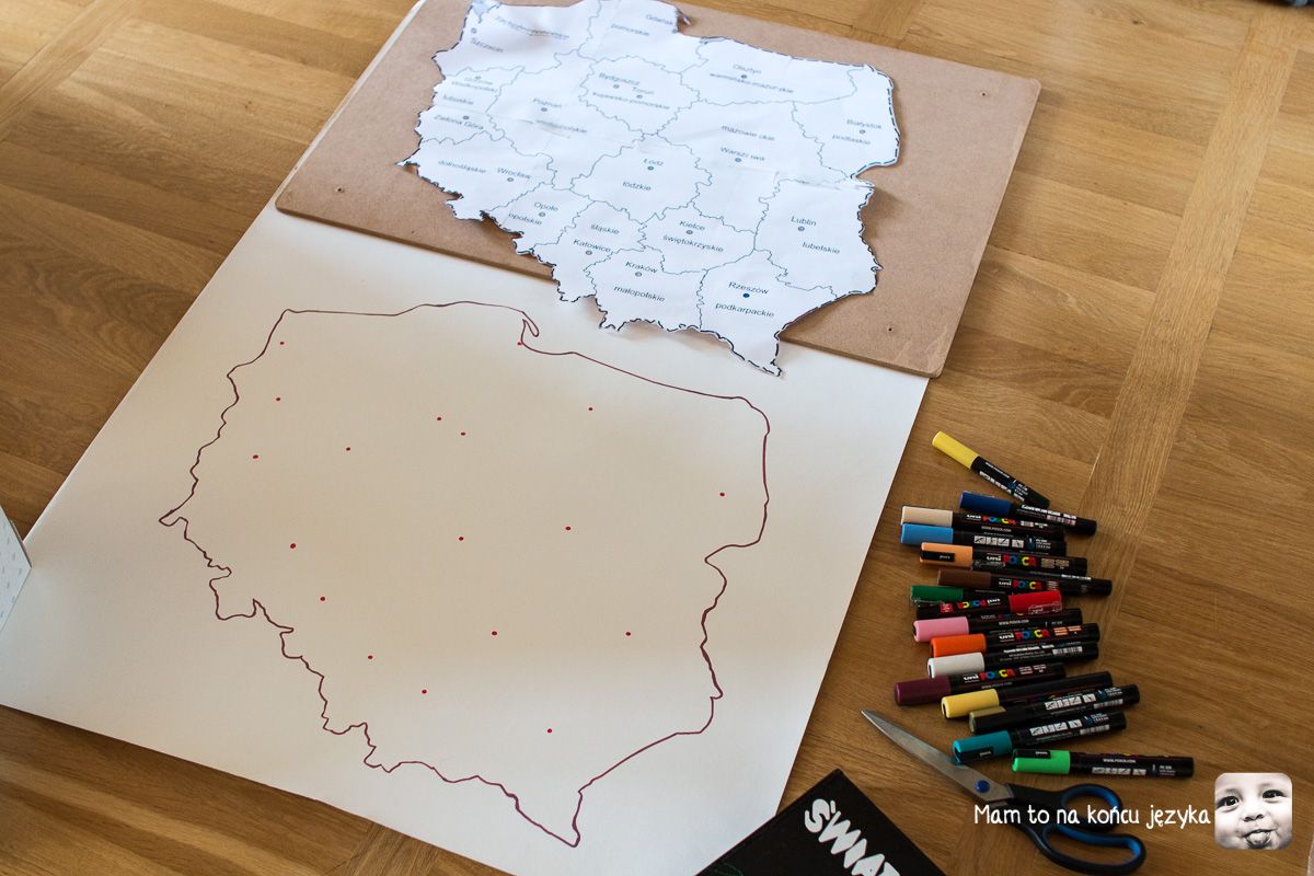 Ja postanowiłam przygotować mapę Polski i wykorzystać jako kanwę do pracy. Przy kółeczkach o średnicy 5cm potrzeba mapy o szerokości około 50 cm, żeby całość była spójna i dało się uwidocznić różnice w lokalizacji miast. Ze strony Bystre dziecko pobrałam mapę konturową Polski z podziałem na województwa i wydrukowałam w skali (chyba) 300%. Potem cięcie, klejenie i wycięcie konturu.