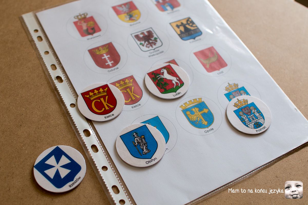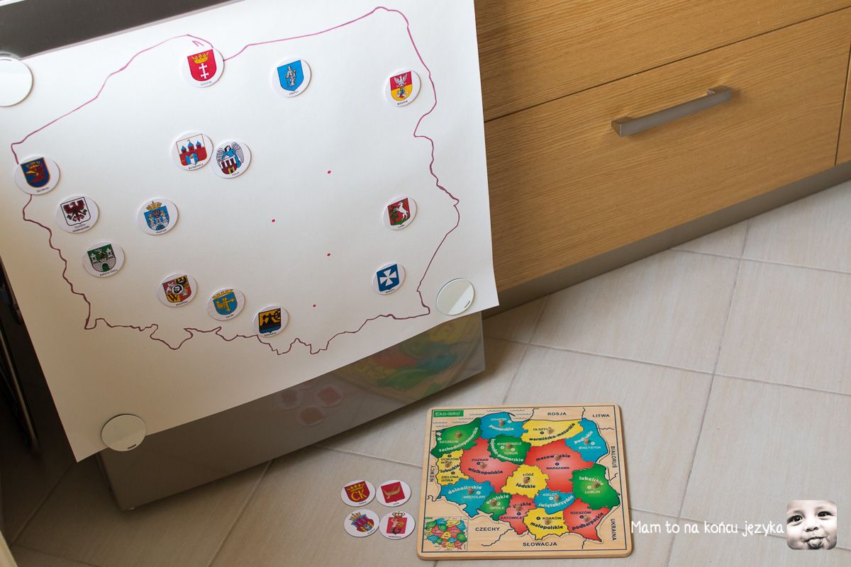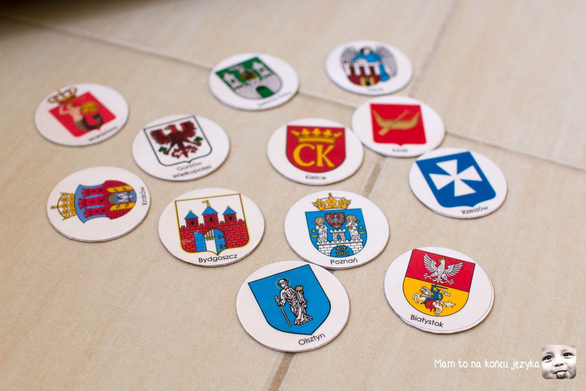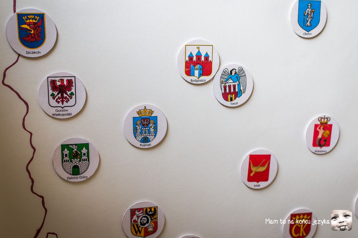 Dodatkowo dochodzi kwestia stopniowania trudności i kontynuacji - dane kategorie pomocy często występują w różnych wersjach, sukcesywnie podnosząc przed dzieckiem poprzeczkę trudności. U nas w przypadku map pierwsze były układanki, gdzie dzieci dopasowały mapę jak puzzle (w puzzlach mamy kontrolę błędu na zasadzie pasuje/nie pasuje). Z chwilą, gdy córka zaczęła czytać, zaczęłam podsuwać pomoce, które wykorzystują nowo nabytą umiejętność i uzupełniają wiedzę o Polsce dodatkowymi informacjami (tu: "miasto X o herbie Y znajduje się tu"). Herb w naszym przypadku traktuję jako formę mnemoniku (czegoś, co ułatwia zapamiętywanie).