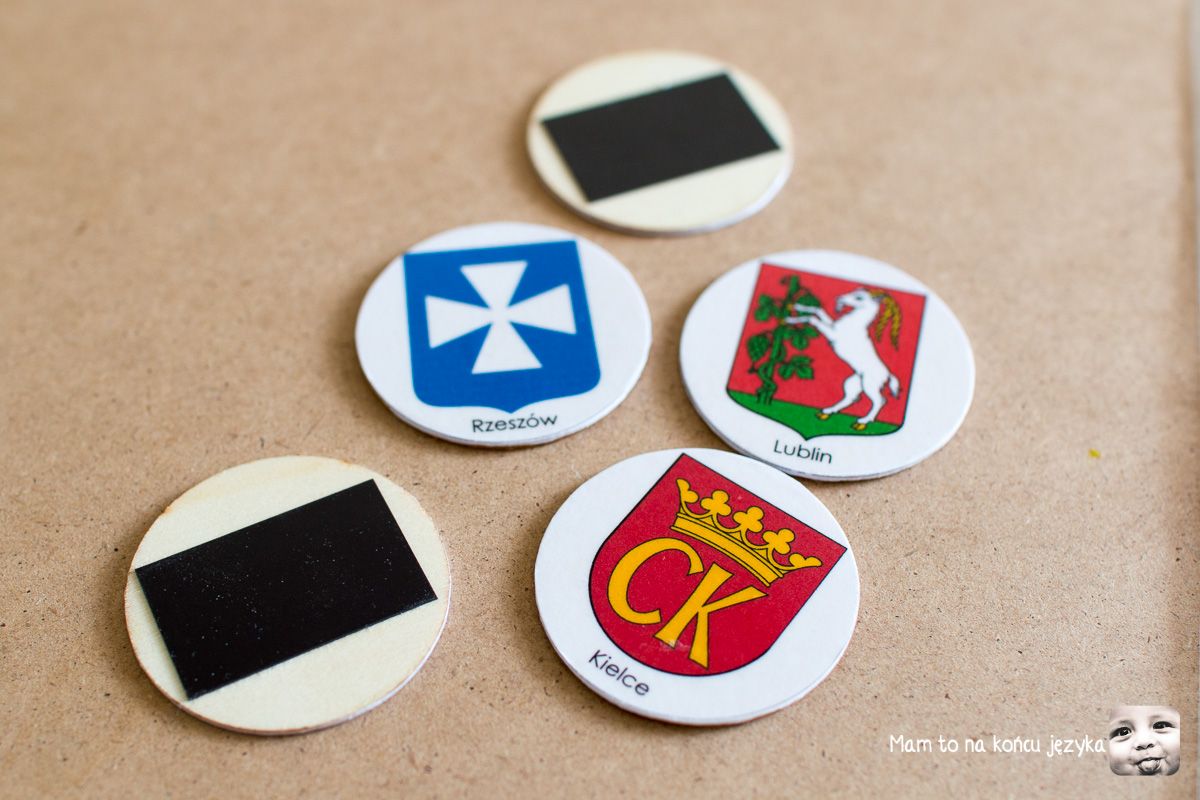 Na końcu wpisu znajdziesz plik do pobrania z herbami miast w 5 cm kółeczkach z podpisami. Skończone wyglądają jak powyżej.
